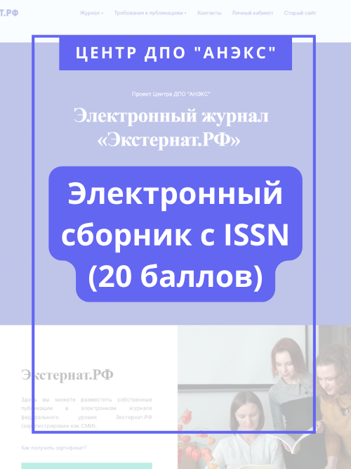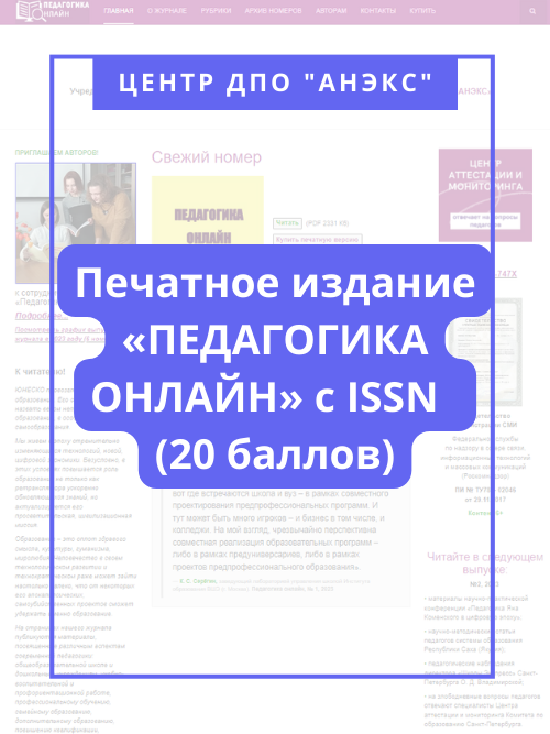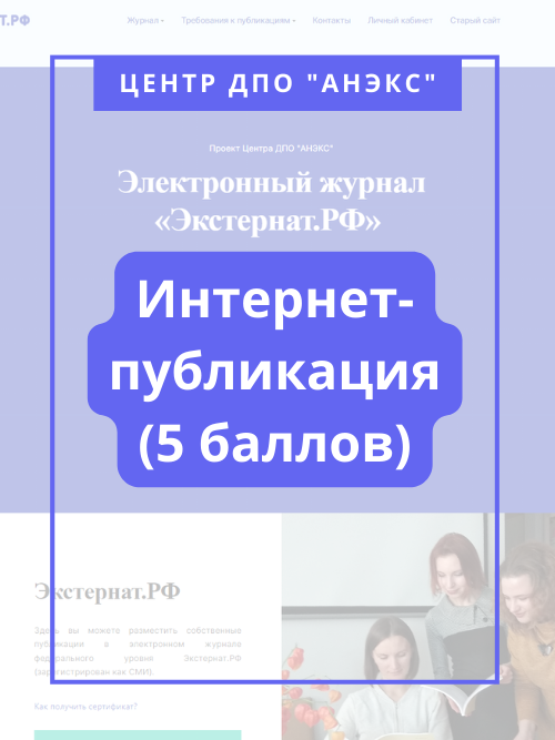 - электронные журналы для педагогических публикаций, в т.ч. научных, «Экстернат.РФ» (федеральный уровень) и «Педагогика.Онлайн» (региональный уровень для педагогов из Санкт-Петербурга);